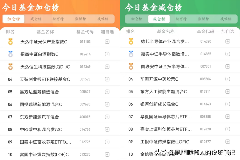 本交易日大数据统计减仓前10的基金分别是:德邦半导体产业混合发起式C、嘉实中证半导体指数增强发起式C、国联安中证全指半导体ETF联接C、前海开源中药股票C、东方人工智能主题混合C、银河创新成长混合C、华夏国证半导体芯片ETF联接C、嘉实上证科创板芯片ETF发起联接C、工银中证传媒指数(LOF)C、金信稳健策略混合。