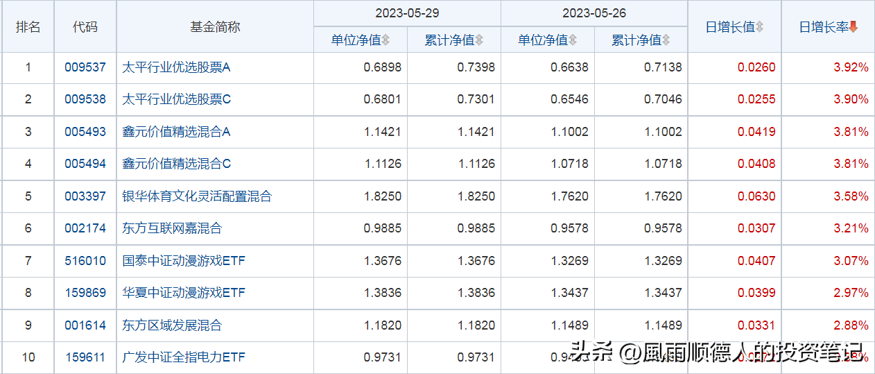 29日开放式基金净值增长排名前10的基金分别是:太平行业优选股票A、太平行业优选股票C、鑫元价值精选混合A、鑫元价值精选混合C、银华体育文化灵活配置混合、东方互联网嘉混合、国泰中证动漫游戏ETF、华夏中证动漫游戏ETF、东方区域发展混合、广发中证全指电力ETF。