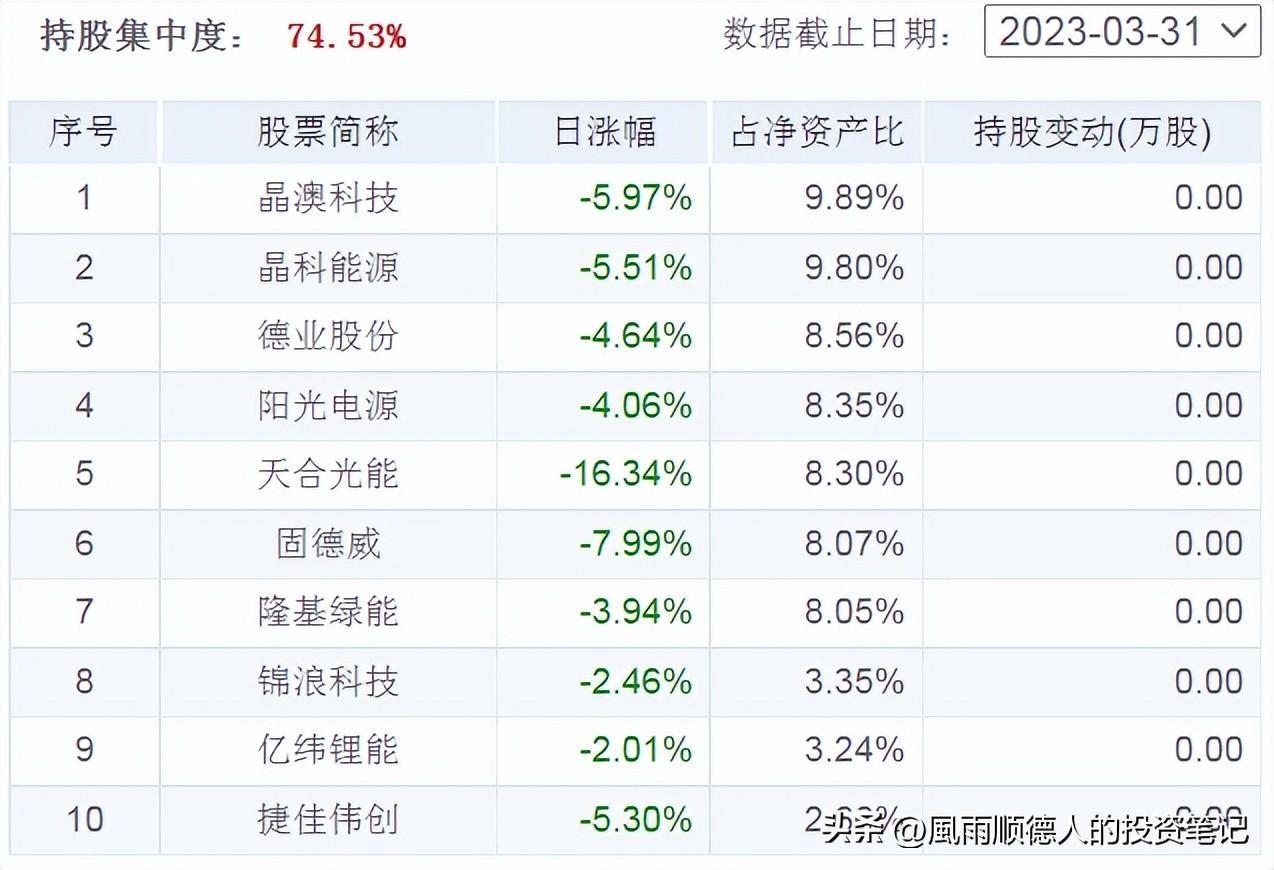该基金的十大持仓中天合光能跌幅逾10%,晶澳科技、晶科能源、德业股份、阳光电源、固德威、隆基绿能、捷佳伟创跌幅较大,前十大持仓占总持仓70.27%,持股集中度:74.53%,基金净值相对跑输市场【基金规模6.51亿元】。