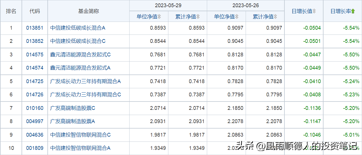 29日开放式基金净值增长排名后10的基金分别是:中信建投低碳成长混合A、中信建投低碳成长混合C、鑫元清洁能源混合发起式C、鑫元清洁能源混合发起式A、广发成长动力三年持有期混合A、广发成长动力三年持有期混合C、广发高端制造股票C、广发高端制造股票A、中信建投智信物联网混合C、中信建投智信物联网混合A。
