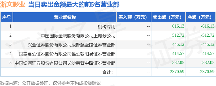 5月30日浙文影业(601599)龙虎榜数据:机构净卖出616.13万元-中国电影股份有限公司影子股