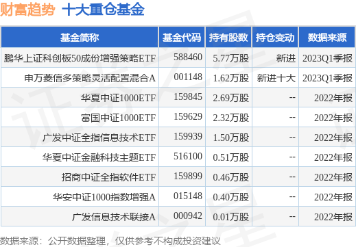 根据2023Q1季报公募基金重仓股数据,重仓该股的公募基金共2家,其中持有数量最多的公募基金为鹏华上证科创板50成份增强策略ETF。鹏华上证科创板50成份增强策略ETF目前规模为4.83亿元,最新净值1.0502(5月29日),较上一交易日下跌1.16%。该公募基金现任基金经理为苏俊杰。苏俊杰在任的基金产品包括:鹏华量化先锋混合,管理时间为2021年3月5日至今,期间收益率为10.79%;鹏华沪深300指数增强A,管理时间为2021年3月5日至今,期间收益率为-14.43%;鹏华中证500指数增强A,管理时间为2022年1月11日至今,期间收益率为-3.54%;鹏华沪深300指数(LOF)A,管理时间为2022年8月3日至今,期间收益率为-5.53%。