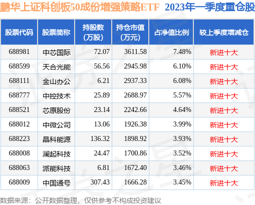 鹏华上证科创板50成份增强策略ETF的前十大重仓股如下: