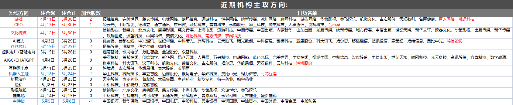 机构资金板块性调仓:5月30日机构净买入超过1000万的个股7只,净卖出超过1000万的个股15只。与周一数据相比,大盘窄幅震荡,机构席位买盘出现腰斩重新回到弱势区,卖盘小幅释放,资金净流出量大幅增加,市场交投活跃度有所下降。板块资金流向上看,主线热点中游戏被中幅加仓、CPO和文化传媒被少量减仓;存储芯片、机器人、中特估被少量减仓。非主线热点中,无板块被加仓,半导体、教育被中幅减仓,化学制药、医疗器械、汽车零部件、汽车电子、脑机接口、数据安全等被少量减仓。可以看出,机构加仓方向仍然集中在AI主题中,且有向AI应用回流的迹象。