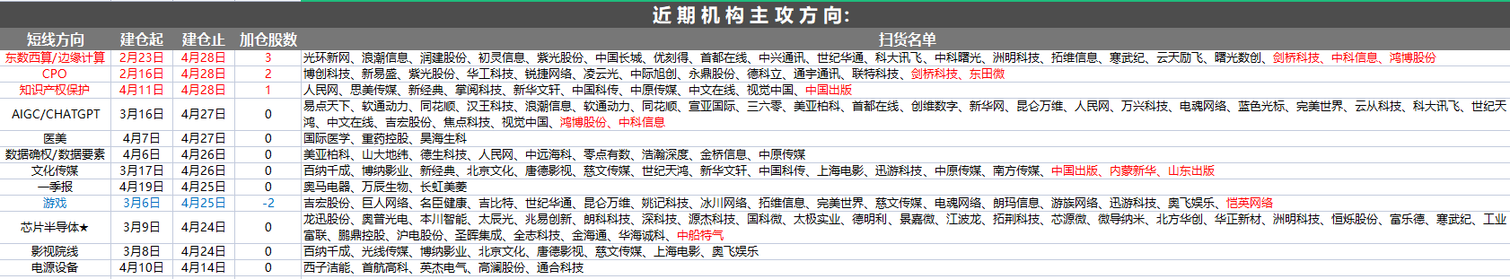 机构资金板块性调仓:4月28日机构净买入超过1000万的个股19只,净卖出超过1000万的个股11只。与上周四数据相比,大盘反弹时机构资金买盘小幅萎缩,卖盘明显萎缩,机构资金净流入量加大,市场交投较为活跃。从板块资金流向上看,主线热点中算力被大幅减仓、CPO被中幅加仓,知识产权保护被少量加仓;游戏被中幅减仓,文化传媒、ChatGPT等AI大主题分歧较为严重。非主线热点中,化学制药被中幅加仓,软件、港口航运、互联网金融、光学光电子等被少量加仓;VR被中幅减仓,无人驾驶、医疗器械被少量减仓。
