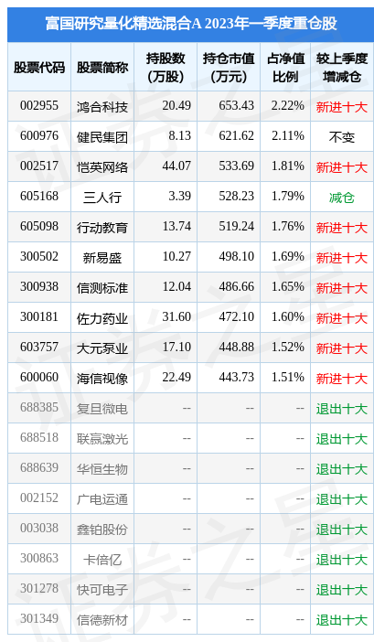 根据2023Q1季报公募基金重仓股数据,重仓该股的公募基金共3家,其中持有数量最多的公募基金为富国研究量化精选混合A。富国研究量化精选混合A目前规模为2.95亿元,最新净值1.824(4月28日),较上一交易日上涨2.33%,近一年上涨12.82%。该公募基金现任基金经理为于鹏。于鹏在任的基金产品包括:富国绝对收益多策略混合A,管理时间为2015年11月26日至今,期间收益率为25.65%;富国中证500基本面精选股票发起式A,管理时间为2022年7月29日至今,期间收益率为1.78%。