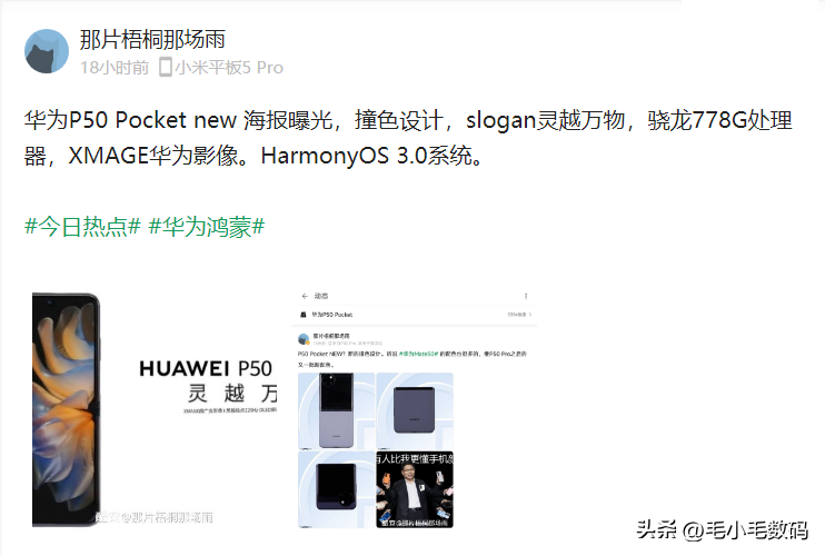 @厂长是关同学 也爆料称,华为 P50 宝盒低配版的 P50 Pocket new 将很快发布,软件方面搭载华为 XMAGE 影像、鸿蒙 HarmonyOS 3.0 应有尽有,不过处理器是骁龙 778G。