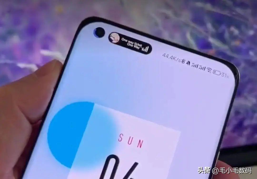 从功能演示画面中可以看出,设计者在小米手机挖孔旁开辟了一块交互区域,平时显示一些必要信息,点击放大能进一步交互,但这块区域并没有对前置镜头开孔进行修饰。