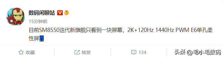 @数码闲聊站 透露,目前在搭载高通骁龙 8 Gen 2 芯片(SM8550)的 iQOO 11 系列手机方案中,只看到了一块 2K 分辨率 120Hz 刷新率的单挖孔柔性屏,该屏幕采用 PWM 调光,三星 E6 基材。