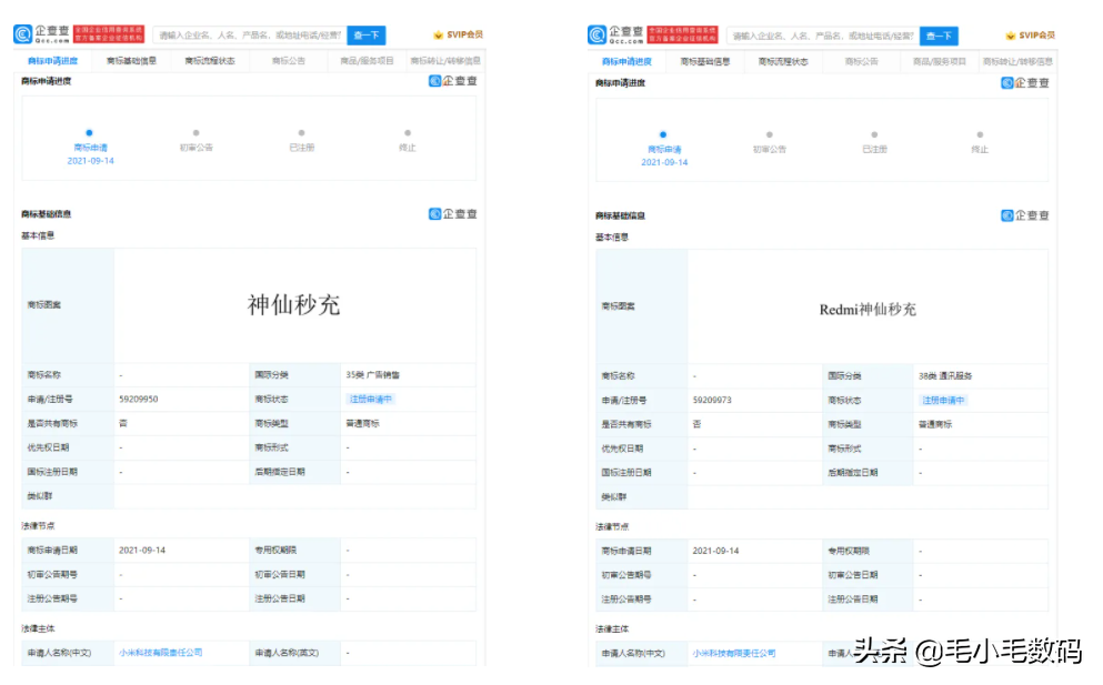 据企查查显示,前几天小米科技有限责任公司申请了名为「神仙秒充」和「Redmi神仙秒充」的商标专利,分别归属于“广告销售/网站服务”和“通讯服务”。