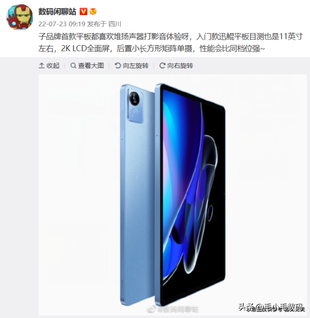 据博主 @数码闲聊站 消息,Redmi 首款平板将在扬声器影音体验方面发力,11 英寸 2K LCD 全面屏,搭载联发科迅鲲处理器,后置小长方形矩阵单摄。