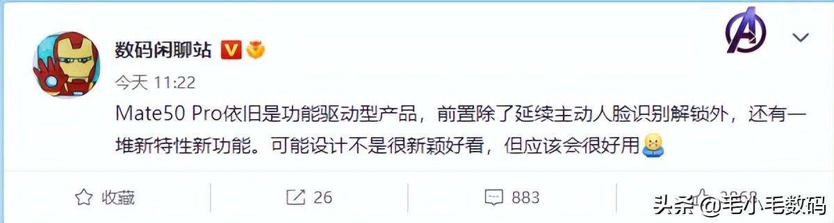 对此,数码博主 @数码闲聊站 表示,华为 Mate50 Pro 依旧是功能驱动型产品,前置摄像头部分除了延续主动人脸识别解锁外,还将带来一系列的新特性、新功能。他还提到,虽然这款新机可能外观设计不是很新颖好看,但应该会很好用。