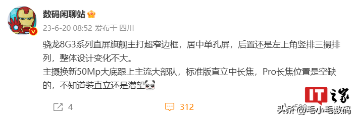 此外,该博主还表示,新旗舰主摄采用 5000 万像素大底主摄,标准版采用直立中长焦镜头,Pro 版尚不确定采用直立中长焦镜头还是潜望式长焦镜头。