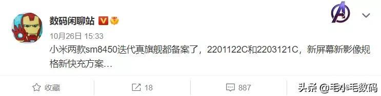 据微博博主 @数码闲聊站 称,小米两款 SM8450 迭代真旗舰都备案了,2201122C 和 2203121C,新屏幕新影像规格新快充方案…,可能就是小米 12 系列要来了。