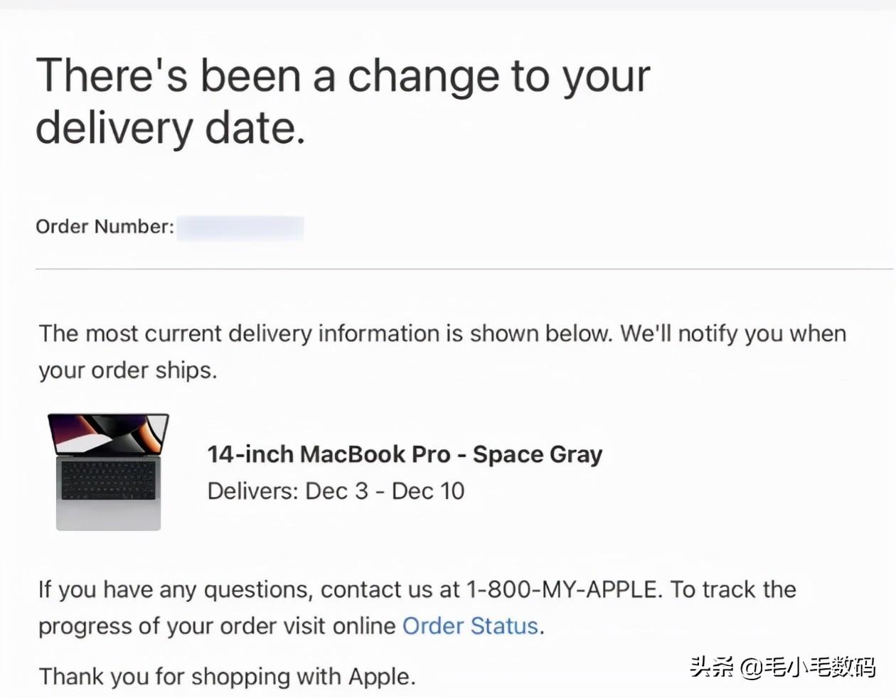 之前,苹果承诺这些用户的订单将于10月26日(今日)发货。但今日,这些用户收到了苹果公司发来的电子邮件,称他们预购的MacBook Pro将于12月发货。