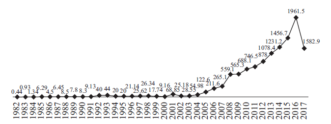 2002年中国建立对外直接投资统计制度以来,到2016年,中国对外投资流量已实现连续14年快速增长,年均增速高达35.8%。2013年中国对外投资首次超过千亿美元。2015年中国对外直接投资实现历史性突破,流量由2002年的全球第26位跃升至全球第2位,对外投资额首次超过利用外资额。2016年中国对外直接投资首次突破两位数,创下1961.5亿美元的历史新纪录,流量规模继续保持全球第2位,占全球比重提升至13.5%。2017年中国对外直接投资虽呈负增长,但仍以1582.9亿美元位列全球第3位,继续保持发展中国家首位。见图1。