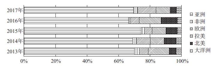 统计数据显示,截至2017年底,中国2.55万家境内投资者在境外共设立对外直接投资企业3.92万家,分布在全球189个国家和地区,境外企业资产总额达6万亿美元,对外直接投资存量达18090.4亿美元。其中,中国对亚洲投资流量占总流量的比重最大,其次是对拉丁美洲、欧洲、北美洲、非洲和大洋洲的投资。2017年,中国对欧洲和非洲当年对外直接投资增长较快,同比分别增长72.7%、71.1%;对北美洲、拉丁美洲、亚洲和大洋洲的对外直接投资同比均呈现下降,分别下降68.1%、48.3%、15.5%和2.1%。受特朗普政府采取的保护主义政策影响,中国企业对美国的直接投资骤降62.2%。图2为2013—2017年中国对外直接投资区域分布情况。