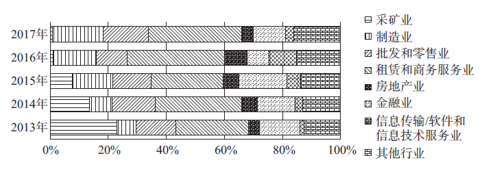 图3为2013—2017年中国对外直接投资流量行业分布情况。