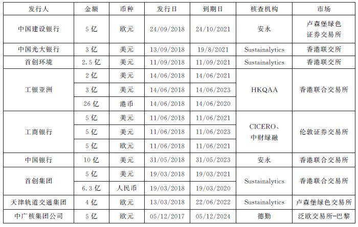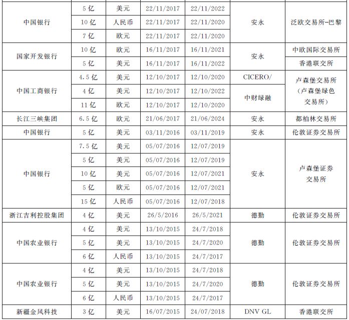 领先大型企业和大型商业银行在海外发行绿色债券,超过中国境内外绿色债券发行总量的40%,其中,工银伦敦和工银亚洲分别在伦敦证券交易所和香港交易所发行了总额为23 亿美元的绿色债券,使得工商银行2018年初成为最大的离岸绿色债券发行人。中国境内主体在境外发行的绿色债券见表3。