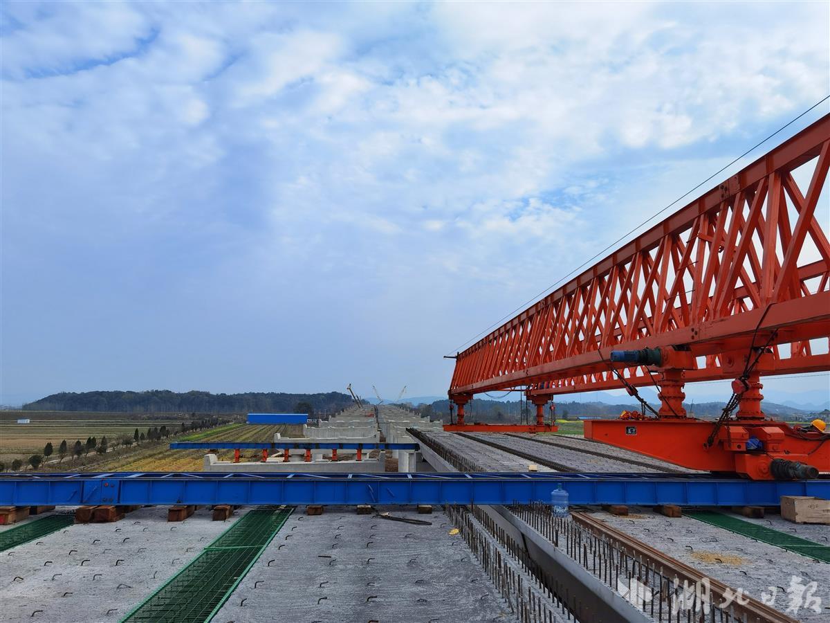 11月30日,在位于黄石的武阳高速富水河特大桥施工现场,架桥机缓缓移动,将一片30米预应力混凝土小箱梁稳稳落在支座上。