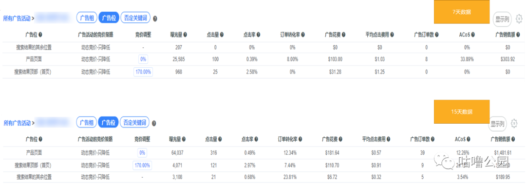 这个精准投放的广告活动的竞价策略与现有的自动和广泛广告活动都不同,此广告是为了卡位,所以使用的是高竞价低广告位置的竞价设置组合,我们的设置是: