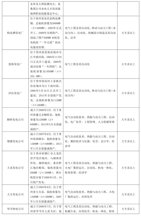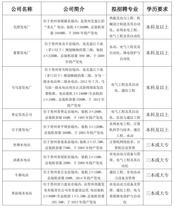 电气工程及自动化、继电保护与自动化、机械设计制造及其自动化、热能与动力工程、水利水电工程、通信工程、计算机科学与技术、计算机信息管理、电气自动化技术、水电站动力设备及管理等专业。报名方式见国企国企招聘网