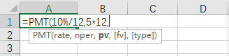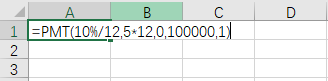 “=PMT(10%/12,5*12,0,100000,1)”