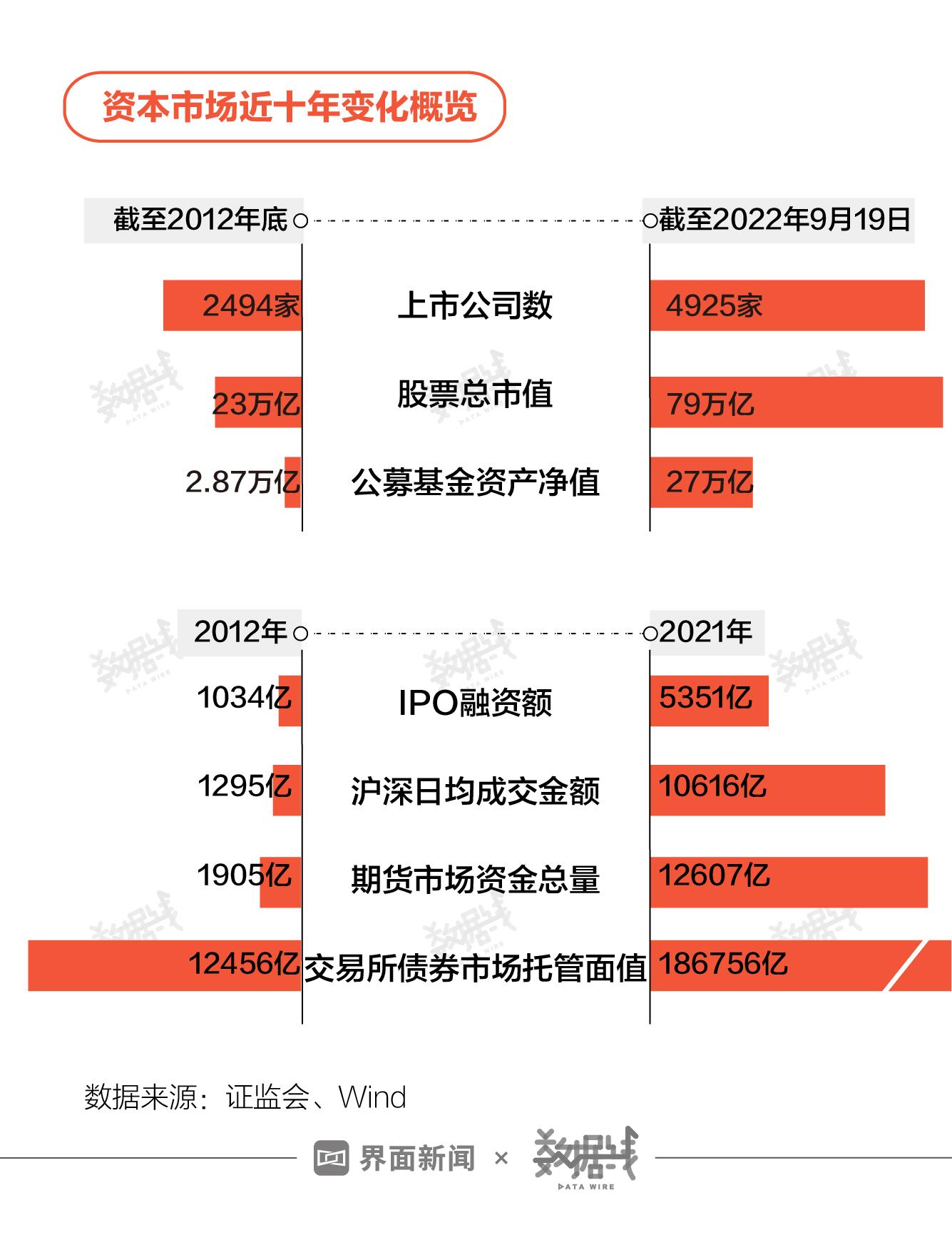 截至2022年9月19日,A股共有4925家上市公司,较2012年底增加了2239家,股票总市值达84.6万亿元,相比2012年底的23万亿元翻了近两番。而在公募基金资产净值、IPO融资额、沪深日均成交金额、期货市场资金总量、交易所债券市场托管面值等数据上,也都呈现几倍甚至十几倍的增长。