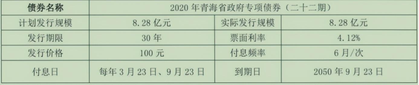 2020年9月22日,2020年青海省政府专项债券(十九至二十二期)正式发行,利率4.12%,期限为30年。