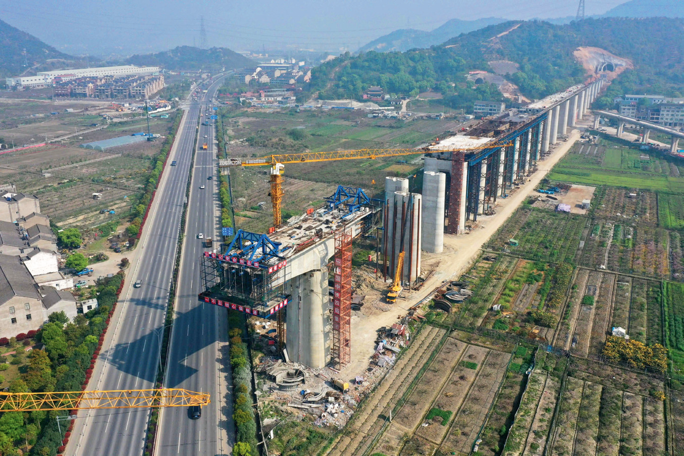 2020 年 4 月 10 日拍摄的杭绍台铁路温岭跨国道 G104 特大桥 ( 摄影 / 新华社黄宗治 )