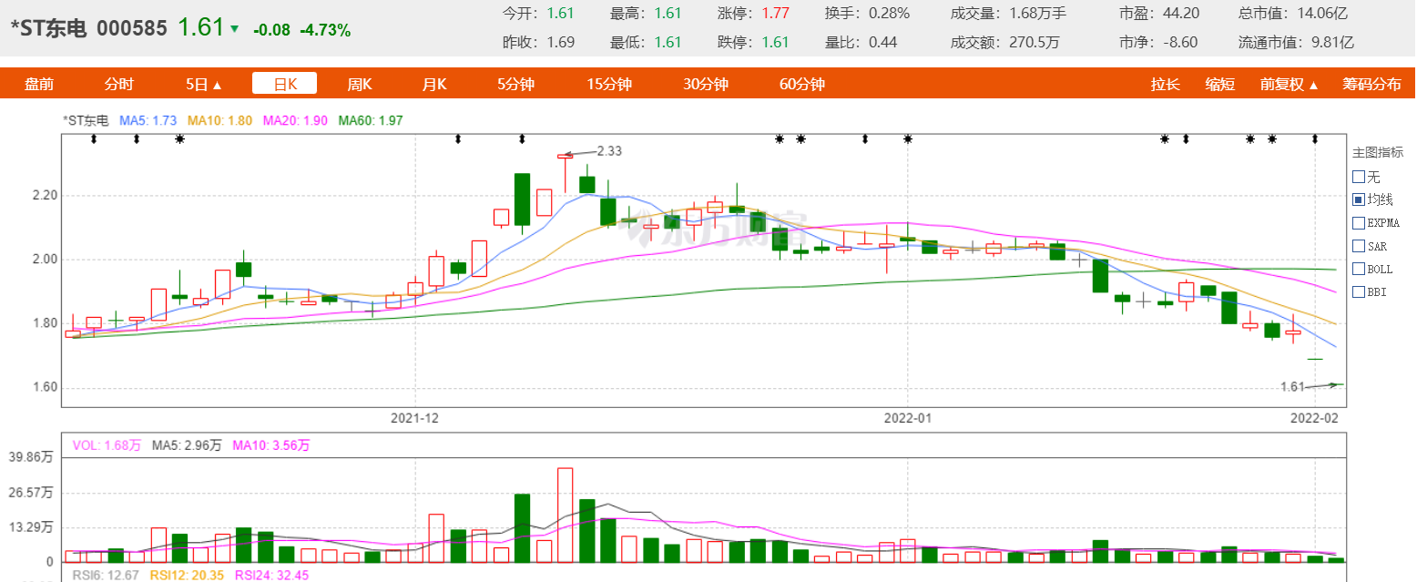 1月28日,*ST东电发布风险提示,经初步测算,预计公司2021年度扣除非经常性损益后的净利润为负值且营业收入低于1亿元、期末净资产为负值,根据相关规则,公司A股股票可能被深交所终止上市,敬请广大投资者注意投资风险。股价上,2022年春节长假后开市的两个交易日,*ST东电均跌停。