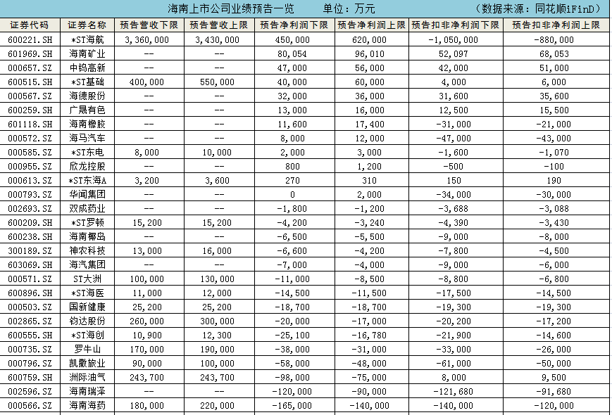 此外,还有5家公司预计实现同比扭亏为盈,分别是*ST东海A、*ST海航、海马汽车、*ST基础、华闻集团。6家公司预计同比由盈转亏,分别为*ST海医、海南椰岛、罗牛山、钧达股份、洲际油气、海南瑞泽。