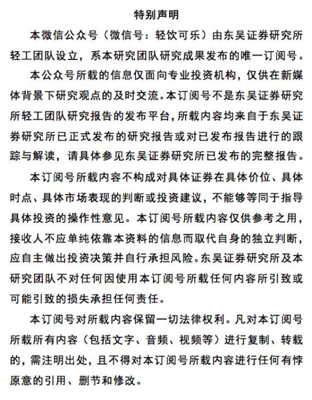 特别声明:《证券期货投资者适当性管理办法》、《证券经营机构投资者适当性管理实施指引(试行)》于2017年7月1日起正式实施。通过新媒体形式制作的本订阅号推送信息仅面向东吴证券客户中的专业投资者,请勿对本资料进行任何形式的转发。若您非东吴证券客户中的专业投资者,为保证服务质量、控制投资风险,请取消关注本订阅号,请勿订阅、接收或使用本订阅号中的任何推送信息。因本订阅号难以设置访问权限,若给您造成不便,烦请谅解!感谢您给予的理解和配合。