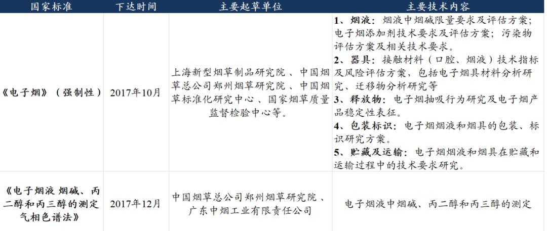 国际上部分地区已有较为明确的电子烟监管/认证方式,如17年推出的UL 8139为针对电子烟的电池、充电器进行检测和认证的北美行业标准;欧盟烟草指令(TPD)14年5月生效对所有进入欧盟市场的新型烟草制品实施注册制管控,并明确烟油中尼古丁含量不得超过20mg/mL;美国食品药物管理局(FDA)16年5月发布了电子烟、尼古丁输送系统(ENDS)及电子烟烟油的上市前烟草产品应用(PMTA),确定了制造商提交新型烟草产品应用的指南。我国目前有两项电子烟标准已经完成审查进入“正在批准”阶段,按标准制定周期预计项目正式结束时间仅剩约3个月:(1)17年10月下达的《电子烟》强制性(具有法律属性)国家标准制定计划,主要标准包括烟液、器具、释放物、包装标识、贮藏与运输;(2)17年12月下达的《电子烟液烟碱、丙二醇和丙三醇的测定气相色谱法》,主要用于电子烟液中烟碱、丙二醇和丙三醇的测定。上述两项计划的归口和执行单位为全国烟草标准化技术委员会,主管部门是国家烟草专卖局。我们认为,国内烟油式电子烟行业在迎来了喷薄式发展的同时也普遍存在价格竞争激烈、产品同质化严重、品牌溢价不明显、烟油成分不规范等现象,而电子烟国标的发布将对产品要求更加严格、企业管理更加规范,客观抬高行业门槛,有利于将加速行业洗牌。