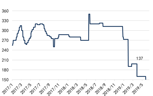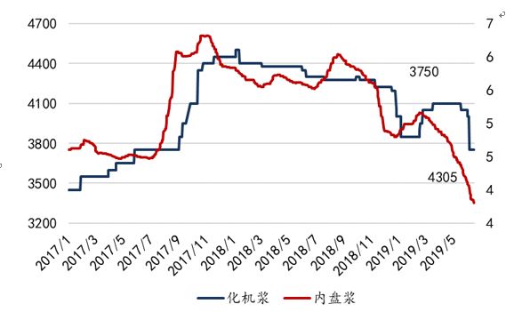 从今年文化纸细分纸种的单吨价格表现来看,截至本周铜版纸吨价上升至5833元/吨(较5月初+100元/吨;较年内低点+300元/吨)、双胶纸6200元/吨(+50元/吨;+183元/吨)。我们认为文化纸下游需求以教辅印刷为主相对刚性、上游供给无大规模计划新建产能(博汇纸业后期拟转产14万吨文化纸项目投建45万吨高档静电复印纸),供需较为稳定,且企业库存自19年1月开始企业库存持续下降至合理水平(目前龙头纸企库存预期仅10天左右),基本面稳健。前期3-5月文化纸旺季提价悉数顺畅落地,且在6月19至20日发布了7月份新一轮涨价函,我们看好下半年文化纸需求维稳、对应龙头纸企业绩趋势向上。