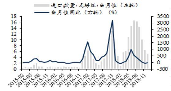 38:瓦楞纸月度进口量及同比(万吨,%)