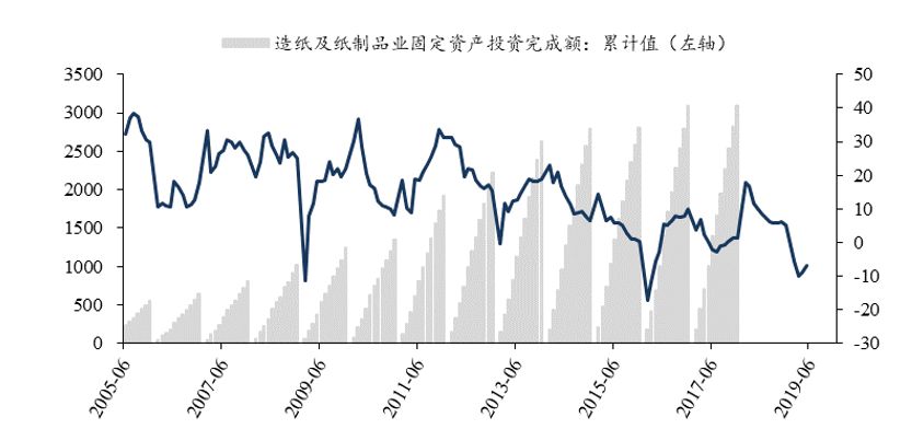 19年5月造纸及纸制品制造业固定资产投资完成额的累计增速-6.80%。