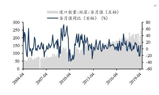图37:纸浆月度进口量及同比(万吨,%)