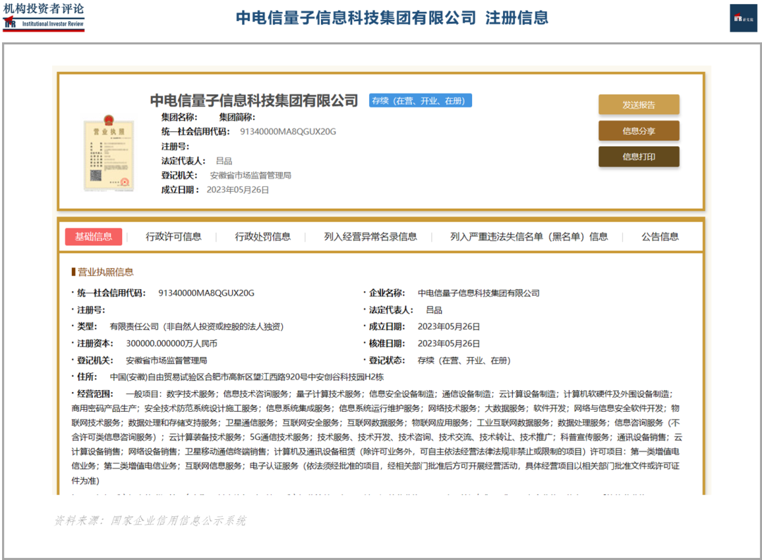 经IIR查询,中电信量子信息科技集团有限公司2023年5月26日注册于安徽省合肥市,由中国电信股份有限公司100%控股;法定代表人吕品,注册资本30亿元人民币