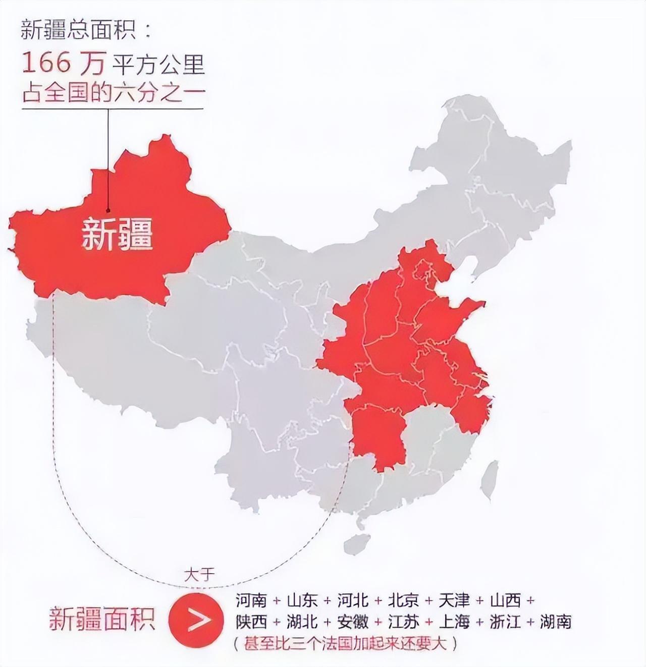 新疆维吾尔自治区是中国最大的省份,约占中国领土面积的六分之一,新疆到底有多大?这么说吧,新疆>河南+河北+山东+上海+北京+陕西+天津+浙江+湖南+湖北+江苏+山西+安徽13个省市加起来还要大。