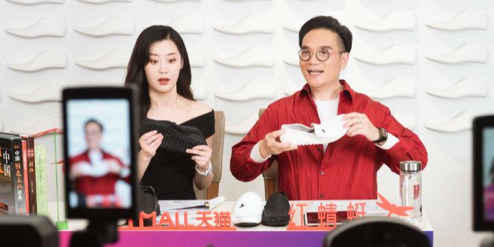3月8日,在红蜻蜓的中国鞋文化博物馆,钱金波穿着一件带有红蜻蜓标志的黑色西装和一条带有亮片的牛仔裤出现在直播中,背后的一面墙摆放着各式各样不同的鞋楦和不同时代的鞋样,与代表当下新零售途径之一的直播相互碰撞。
