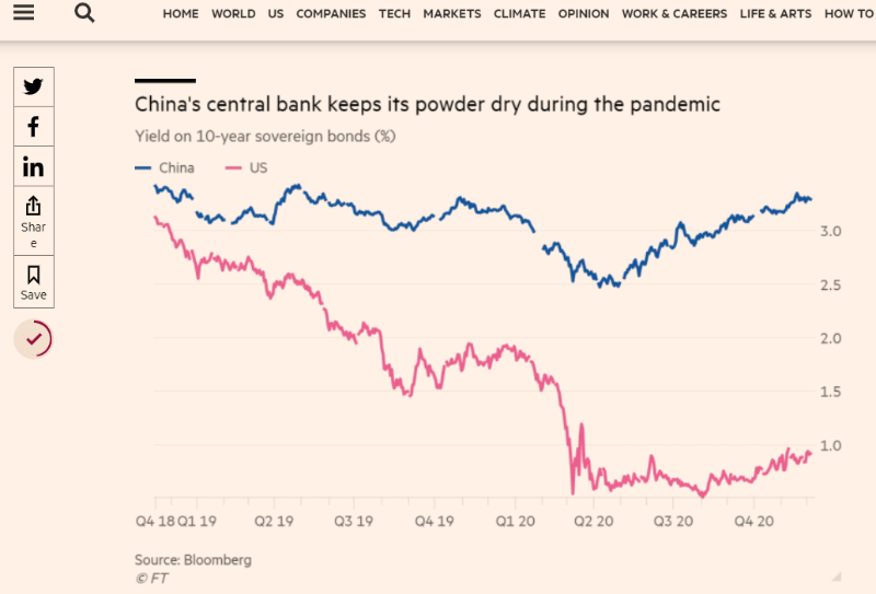 中美10年期主权债券收益比较图,蓝色为中国主权债券,红色为美国主权债券。图片来源:《金融时报》报道截图