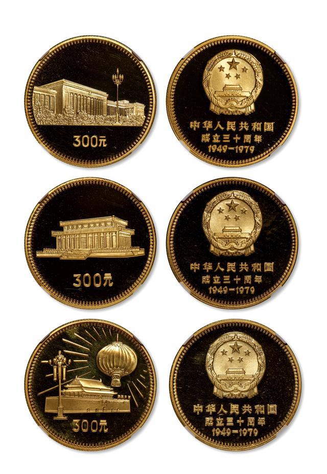1979年中国第一套金币“中华人民共和国成立30周年纪念金币”未采用稿试铸样币三枚,分别为:“天安门300元金币”“人民大会堂300元金币”“毛主席纪念馆300元金币”。该套为上呈试样,未正式铸行,图案设计主题鲜明,铸工极尽精美,拍卖首次出现,三枚都为NGC MS69 ULTRA CAMEO,2.7*0.20厘米,收藏价值极高。