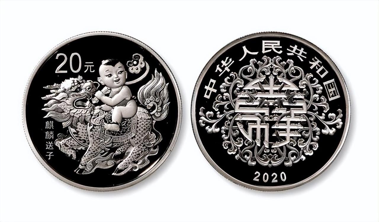 2020年吉祥文化“麒麟送子”银质纪念币精制,直径:40毫米,厚度:0.31厘米,面值:20元,重量:60克,成色99.9%,最大发行量:20000枚,附证书及原盒,证书编号06666,完全未使用品。