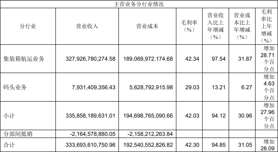 扣非净利润增长主要是运价增长,公司毛利率同比大幅增长,2021年集装箱业务毛利率42%,同比增加29个百分点。