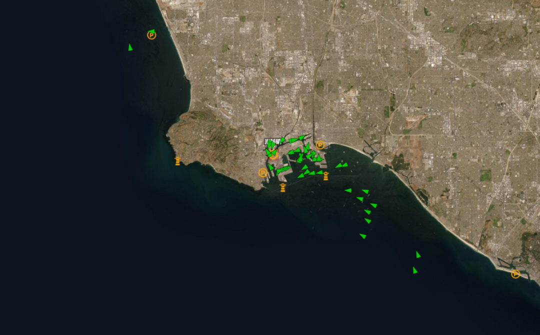 看一下跨太平洋航线(远东-美西),洛杉矶港和长滩港是美国西海岸排名前二的大港,从10月9日实时地图上看,拥堵情况明显已经缓解(附近海域没有大规模停船)。