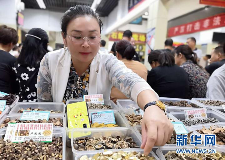 9月14日,在亳州亳州中药材专业市场,一位商户在整理药材。新华网 李东标 摄