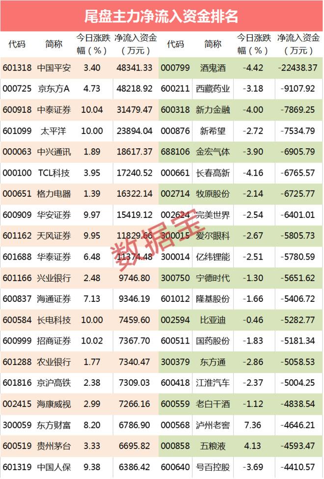 A两只个股尾盘流入资金超4亿元。