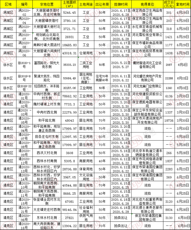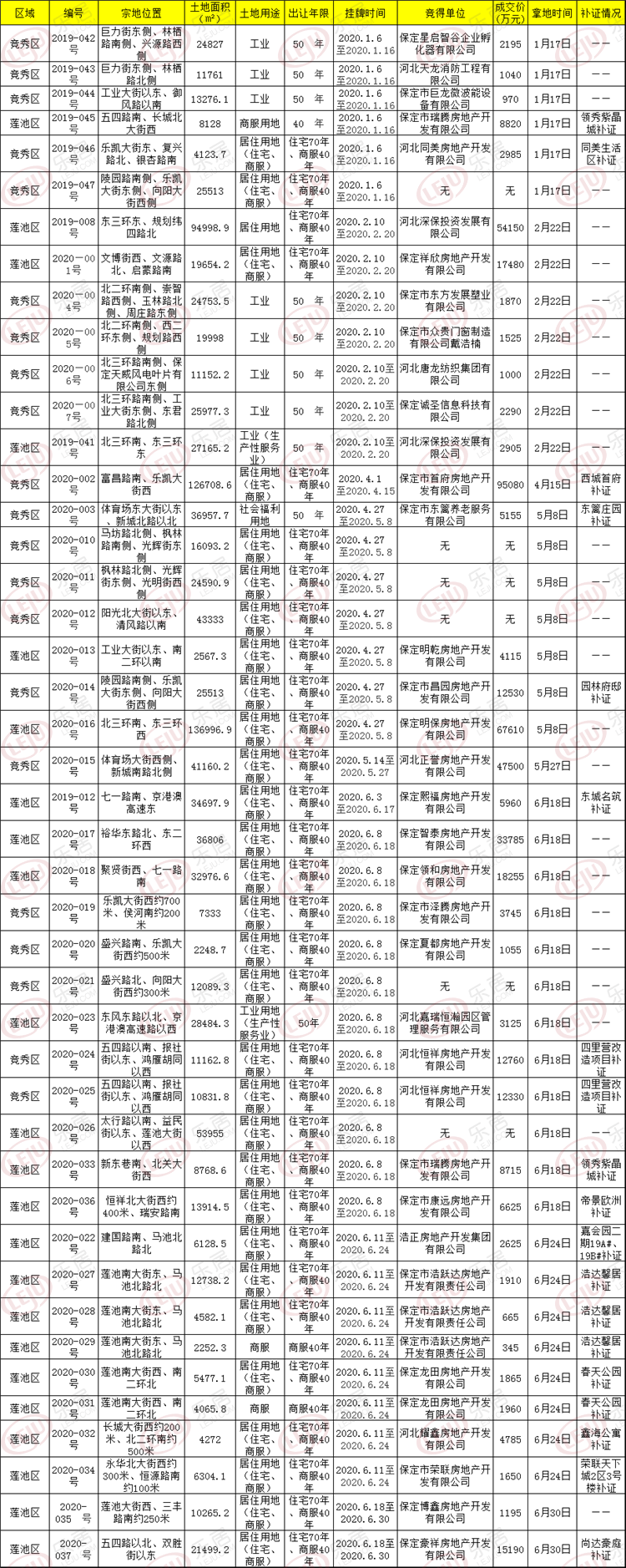 2020年上半年,保定城区共58宗地块成功出让,其中主城区共38宗地块成功出让,总计出让面积1380.8亩,占上半年土地出让总量的60%。
