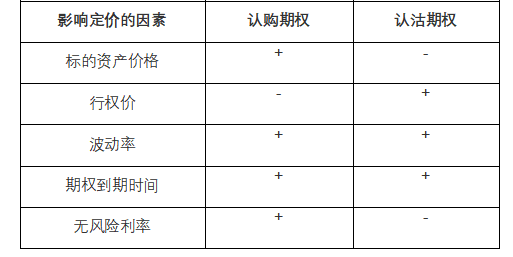 影响期权定价的因素汇总表(+代表正相关,-代表负相关)